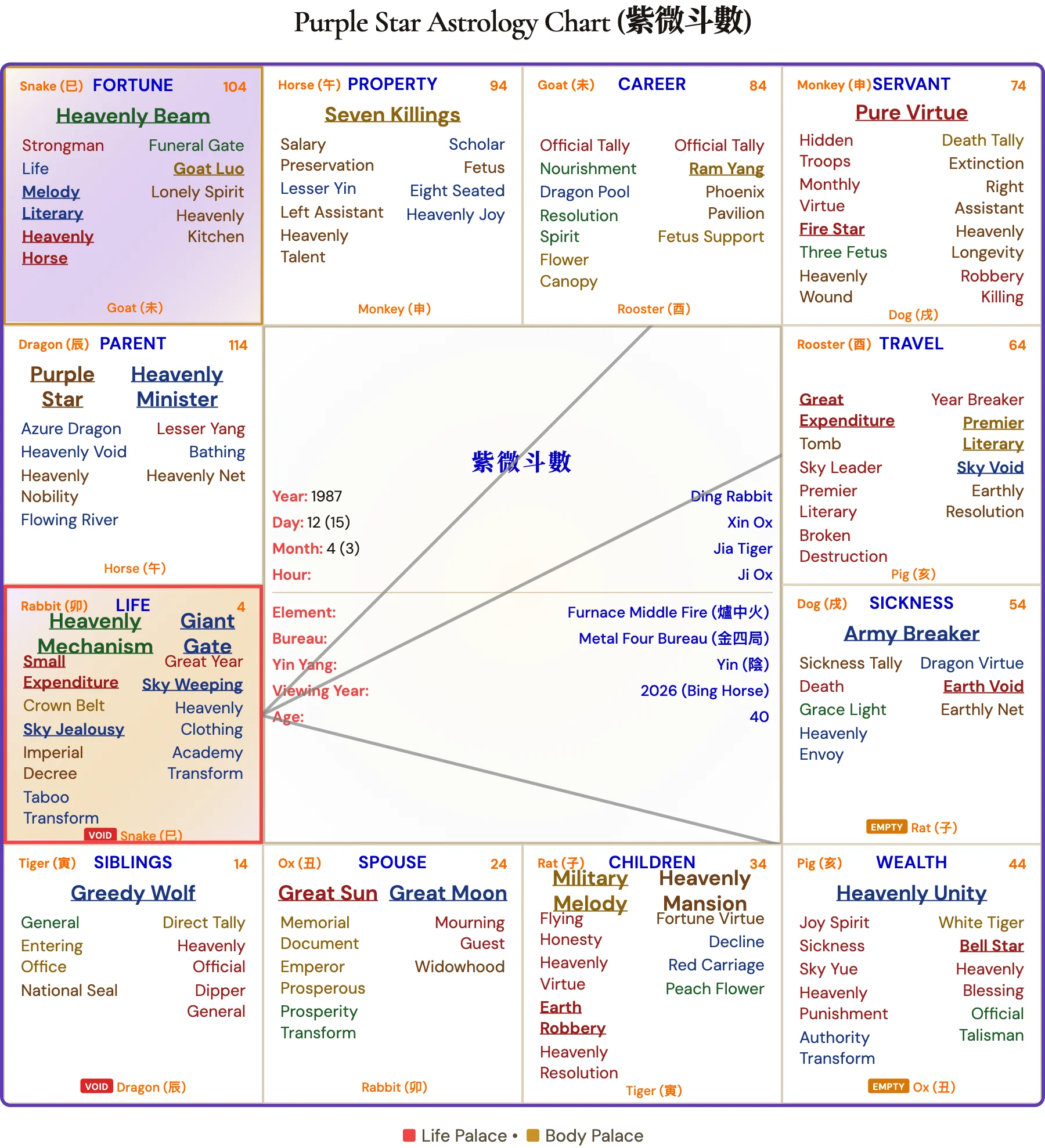 The long arc involves transitioning from the restless brilliance of the performer to the established wisdom of a creative patriarch. The tension lies in balancing the solitary, analytical nature hinted by Widowhood 寡宿 with the nurturing, fortune-bringing partnership of the Spouse Palace. The ultimate achievement is building a dynasty—artistic, familial, or both—that outlasts the stage lights.