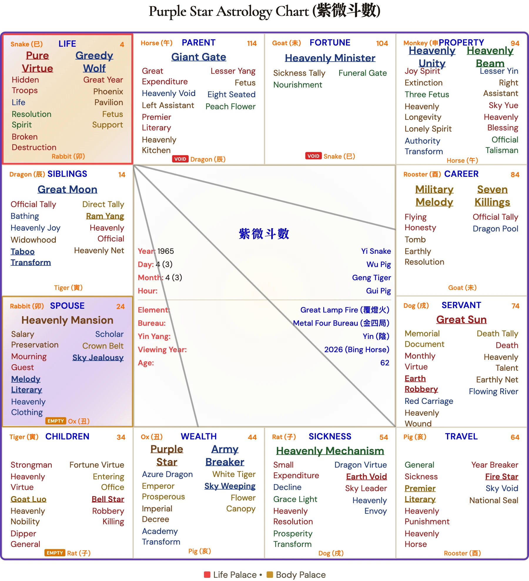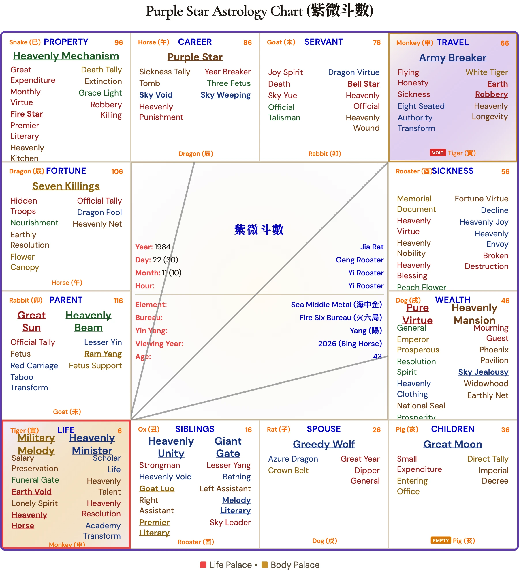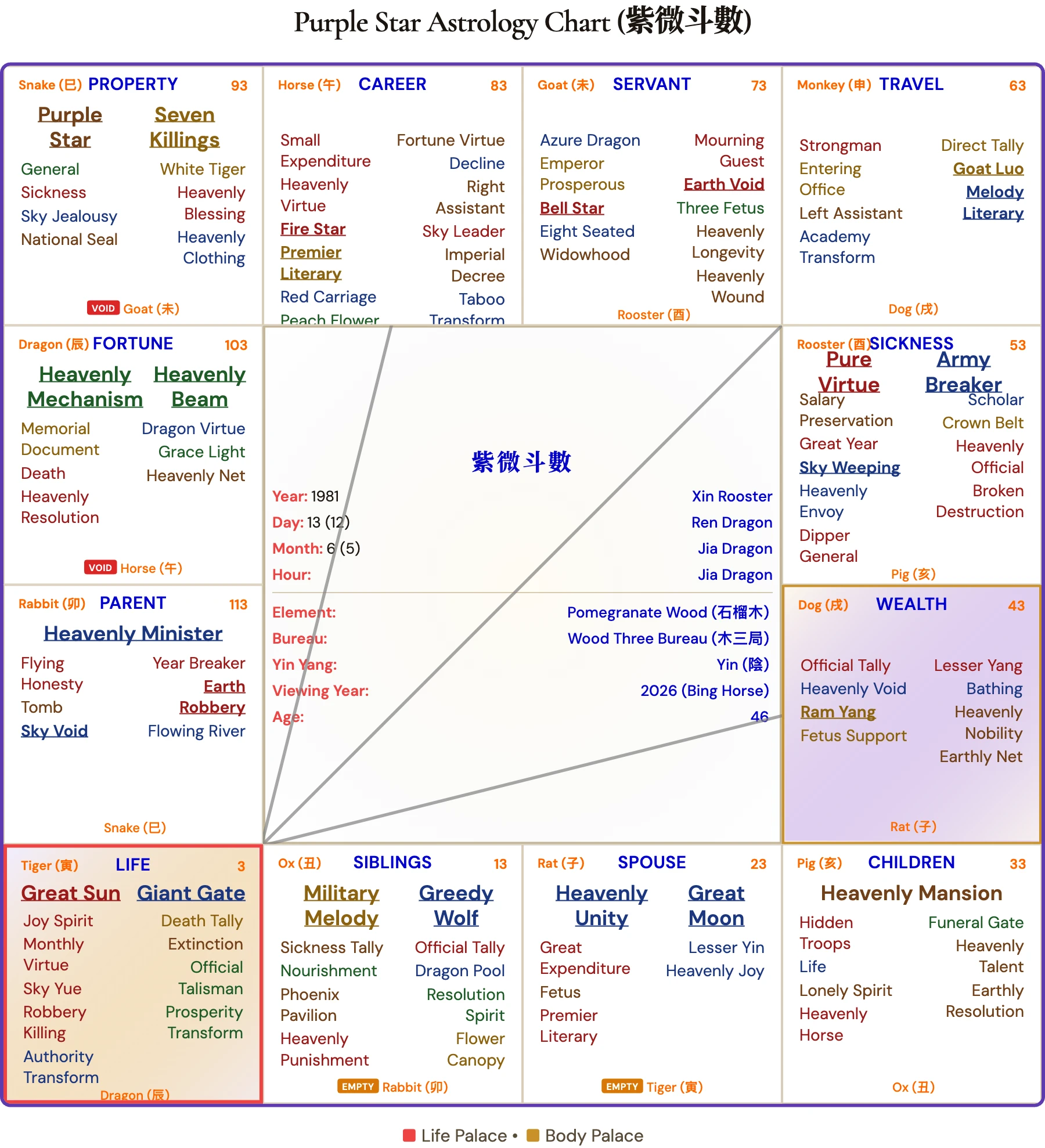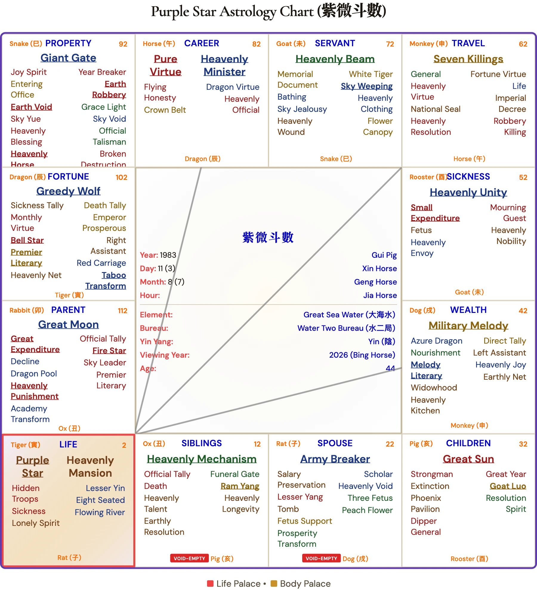 Why we ran all 12 hours: Chris Hemsworth's birth hour has never been publicly confirmed. In Purple Star Astrology, the birth hour determines the Life Palace and shapes the entire chart. We generated all 12 possible charts — one per two-hour window — and identified Hour 7 (Horse 午, 11:00 AM–1:00 PM) as the configuration whose palace readings best match the documented trajectory of Chris Hemsworth's career, wealth, relationships, and public challenges.