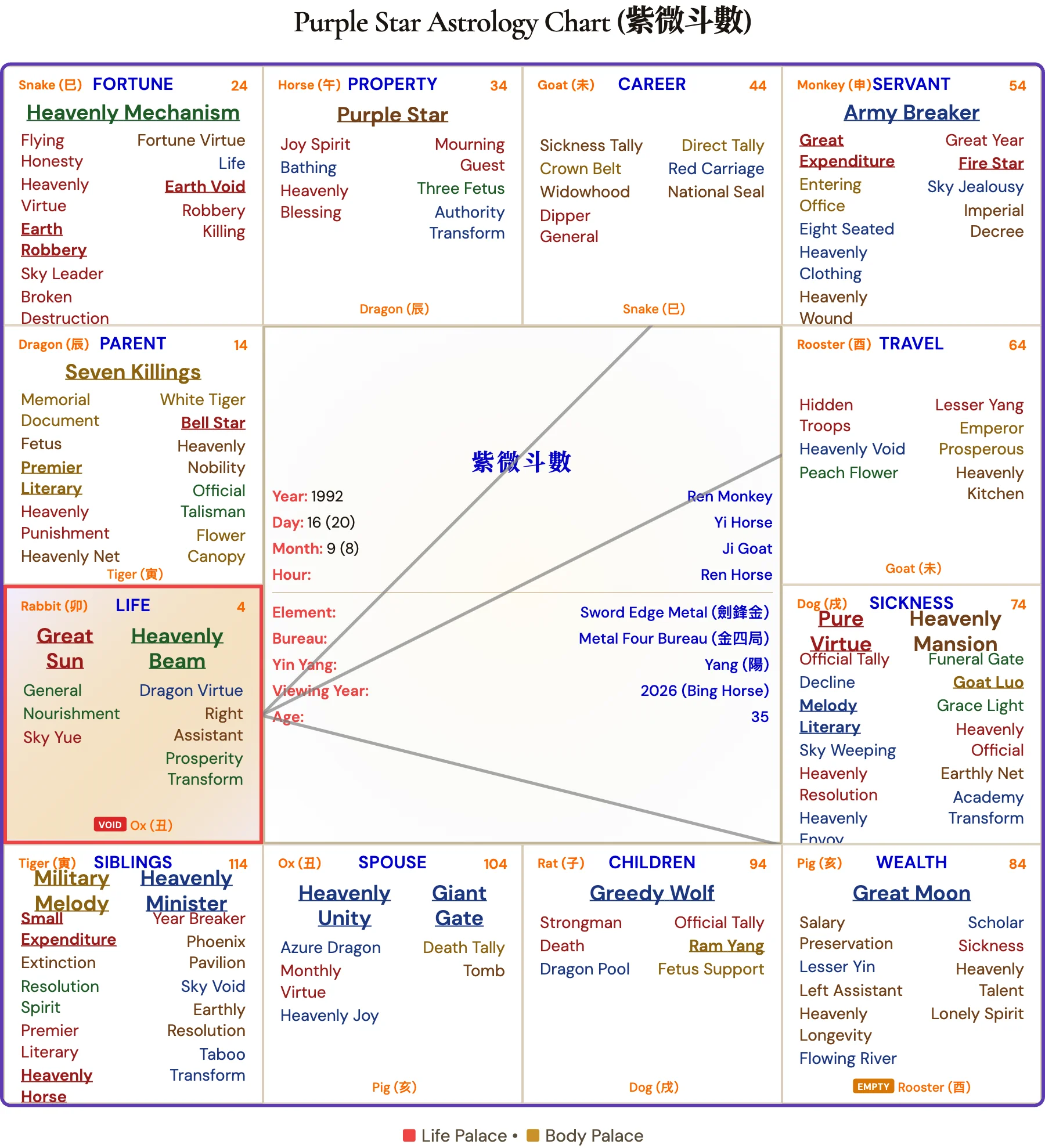 Why we ran all 12 hours: Nick Jonas's birth hour has never been publicly confirmed. In Purple Star Astrology, the birth hour determines the Life Palace and shapes the entire chart. We generated all 12 possible charts — one per two-hour window — and identified Hour 7 (Horse 午, 11:00 AM–1:00 PM) as the configuration whose palace readings best match the documented trajectory of Nick Jonas's career, wealth, relationships, and public challenges.