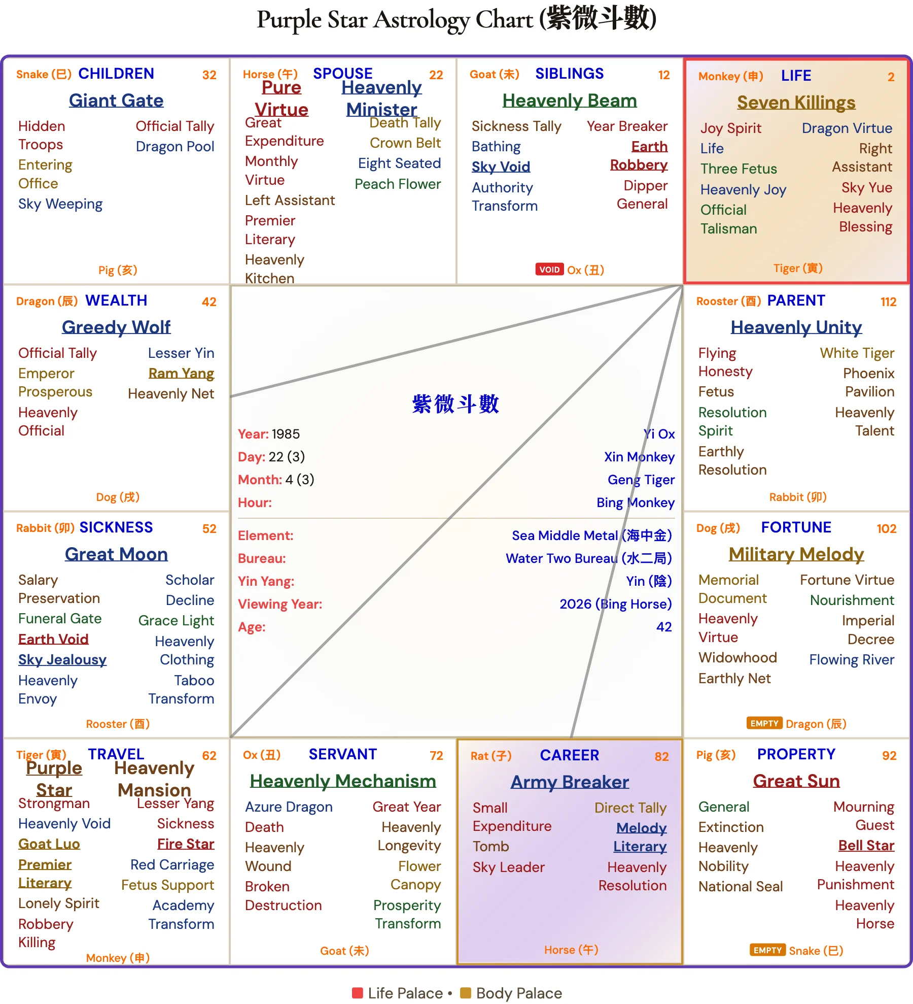 The revolutionary fires of Army Breaker 破軍 subside, giving way to the consolidating influence of the Life Palace's Seven Killings 七殺. This period will focus on fortifying gains, establishing governance, and building institutional legacy from the previous upheaval. For Altman, this signals a shift from launching new assaults to securing the territory won, potentially through policy influence or structural reorganization of his ventures.