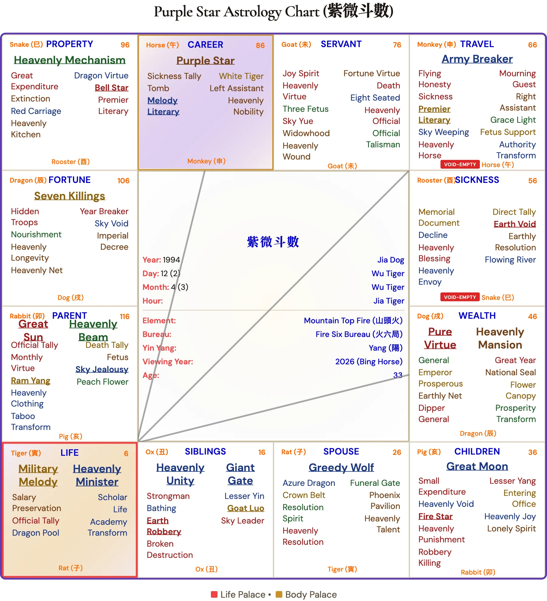 Why we ran all 12 hours: Saoirse Ronan's birth hour has never been publicly confirmed. In Purple Star Astrology, the birth hour determines the Life Palace and shapes the entire chart. We generated all 12 possible charts — one per two-hour window — and identified Hour 3 (Tiger 寅, 3:00–5:00 AM) as the configuration whose palace readings best match the documented trajectory of Saoirse Ronan's career, wealth, relationships, and public challenges.