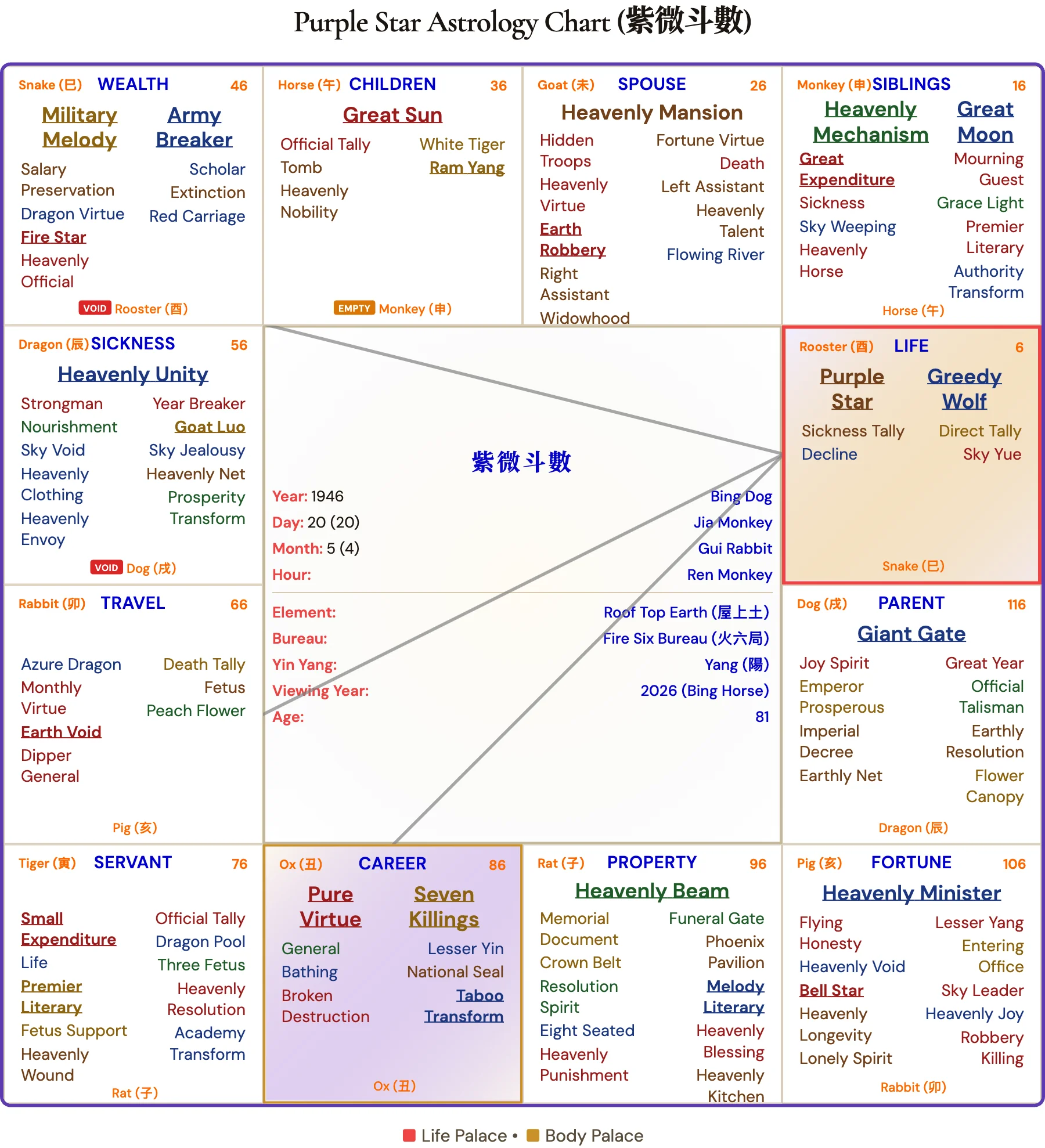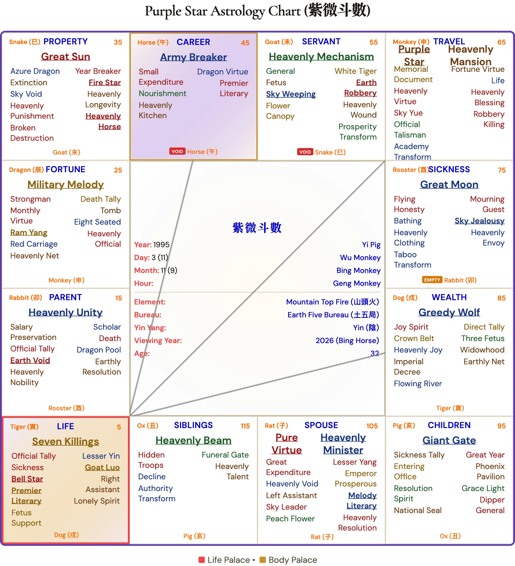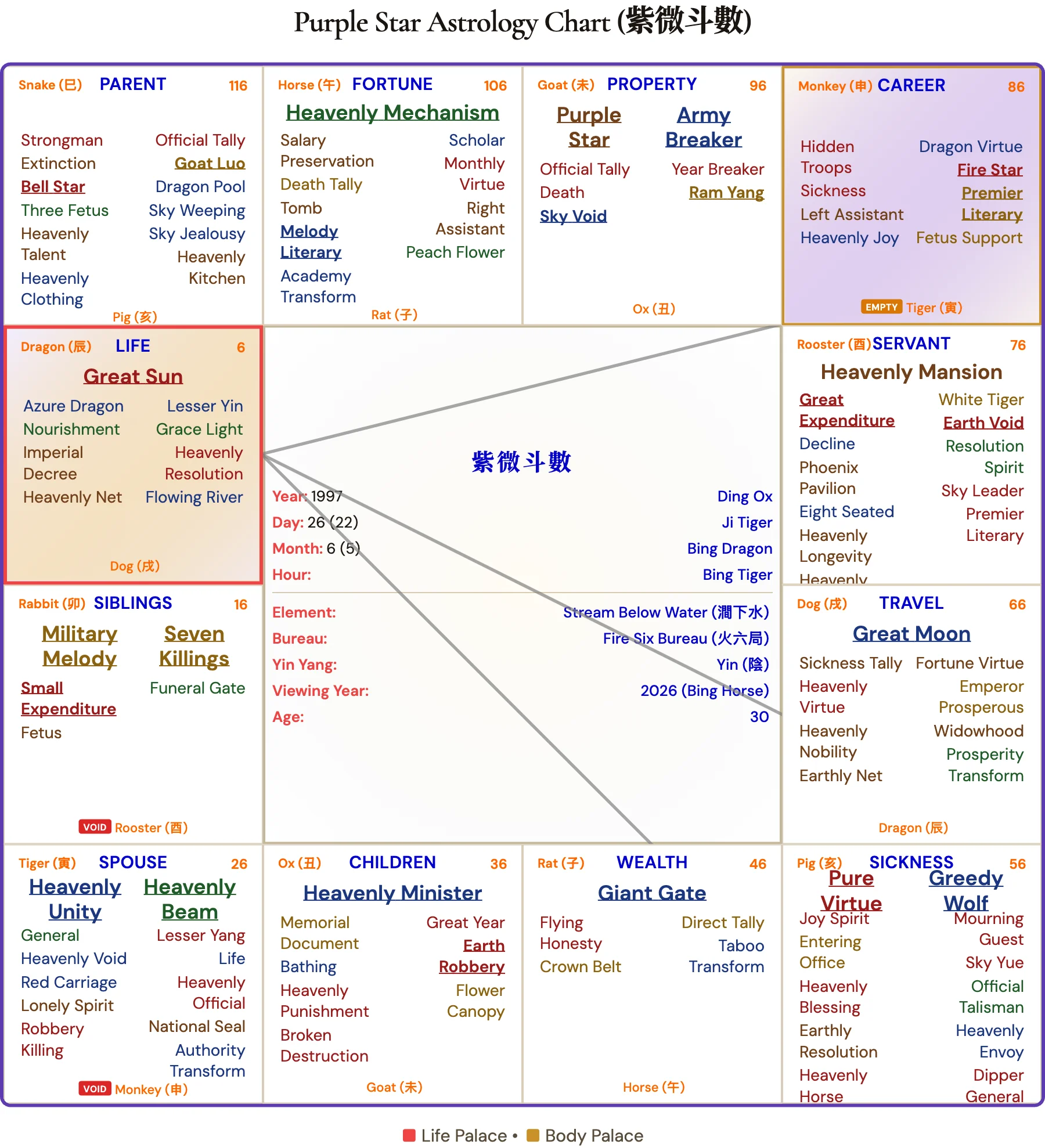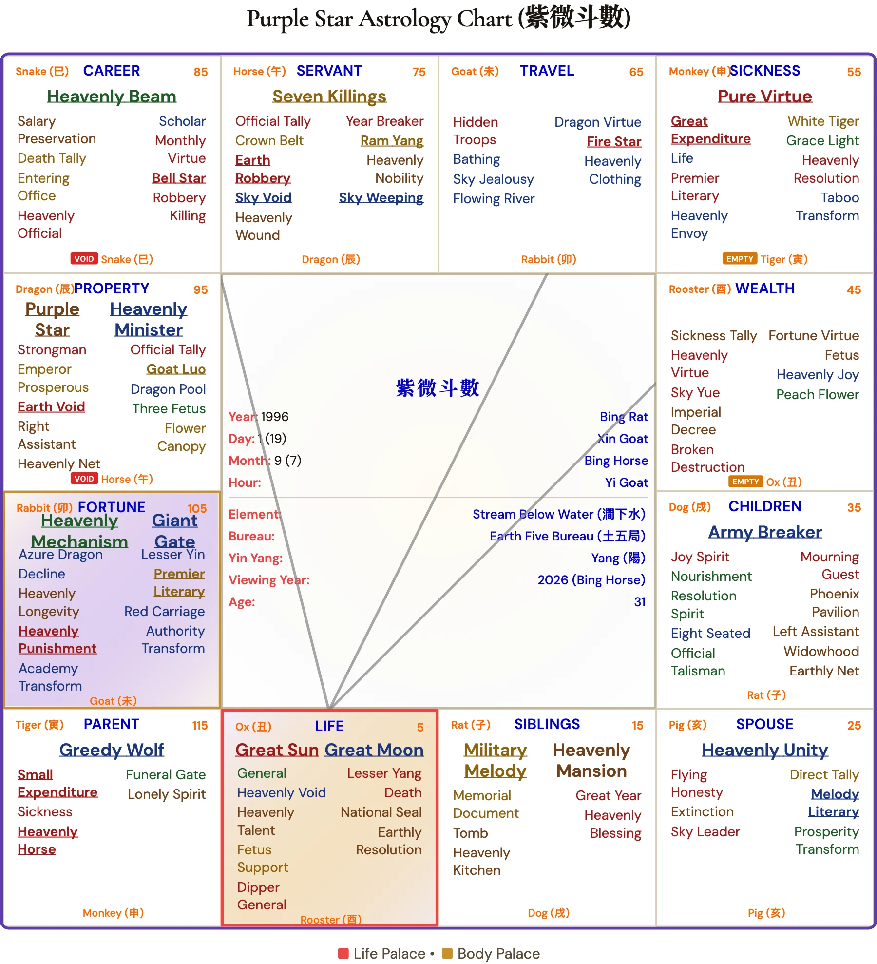 Why we ran all 12 hours: Zendaya's birth hour has never been publicly confirmed. In Purple Star Astrology, the birth hour determines the Life Palace and shapes the entire chart. We generated all 12 possible charts — one per two-hour window — and identified Hour 8 (Goat 未, 1:00–3:00 PM) as the configuration whose palace readings best match the documented trajectory of Zendaya's career, wealth, relationships, and public challenges.